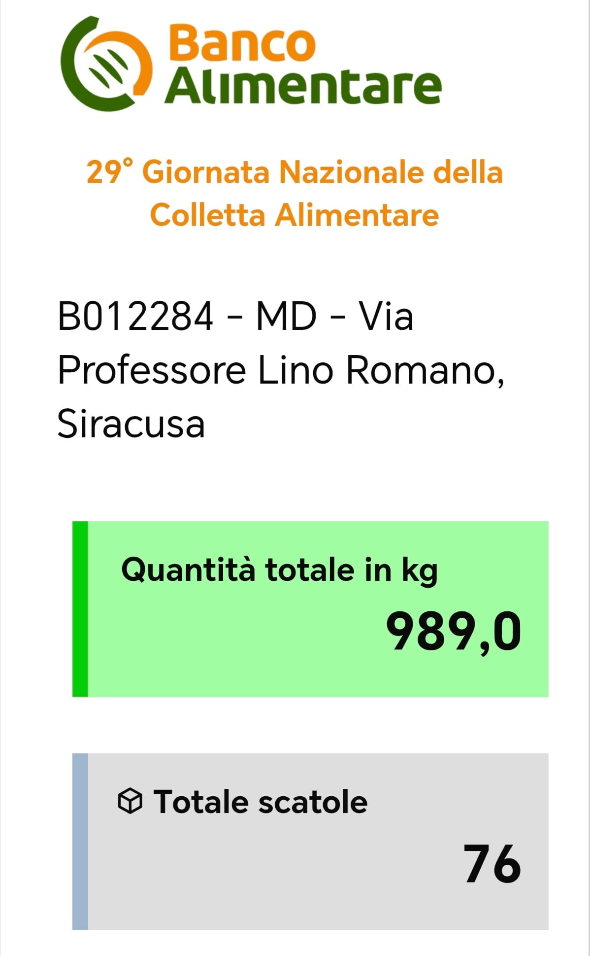 La giornata è stata "felice" sotto molti punti di vista: oltre alle condizioni meteo favorevoli, la disponibilità della gente comune venuta a fare la spesa ha permesso di superare ampiamente il risultato dell'anno precedente. Infatti, il risultato è stato entusiasmante, con una raccolta di ben 989 Kg. di derrate in 76 scatoli, inviati in 4 steps al centro di raccolta siracusano del Banco Alimentare.